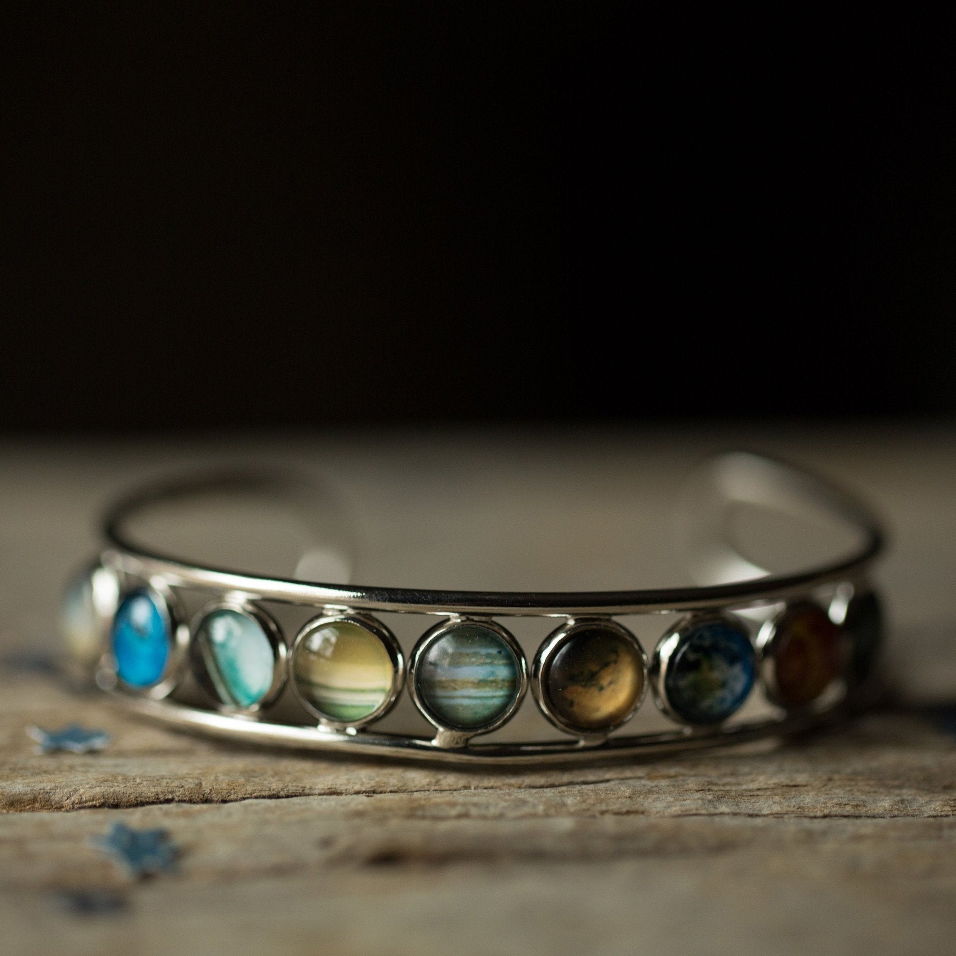 Have you ever wanted our majestic Solar System hanging about your wrist? With this beautiful and simple cuff bangle bracelet, you can do just that. A planetary celebration, this Solar System cuff is a simple but unique statement piece. With our design, you get all of the planets (yes, even Pluto!) on an adjustable bracelet. Looks great with !